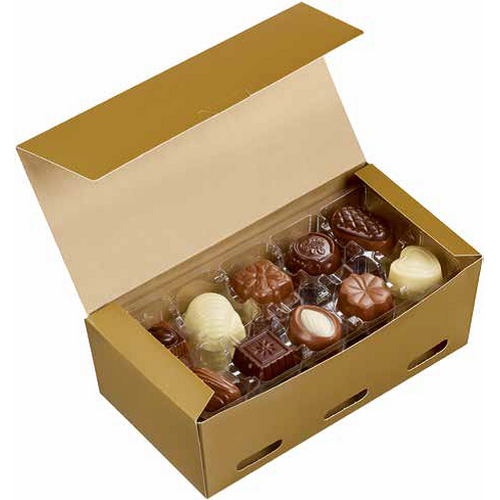 Des bonbons au chocolat belge emballés dans un coffret cadeau avec un papier d’emballage festif et un nœud noué à la main. Chaque bonbon consiste d’un délicieux fourrage enrobé de chocolat (blanc – lait – noir), variant entre vanille, mousse au chocolat, caramel, pistache, noisette, orange ou fraise.
