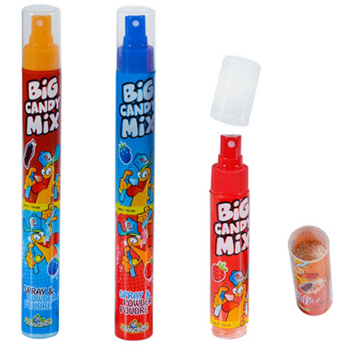 Big Candy Mix est un Méga Bonbon 2 en 1 (hauteur 25 cm !!): en haut un Spray de 50 ml, et en dessous un tube de poudre acidulée 30 g ! Avec 2 saveurs différentes à chaque extrémité ! Rigolo et original, on s’amuse déguster la poudre citrique ; pour ensuite l’asperger de spray acidulé !