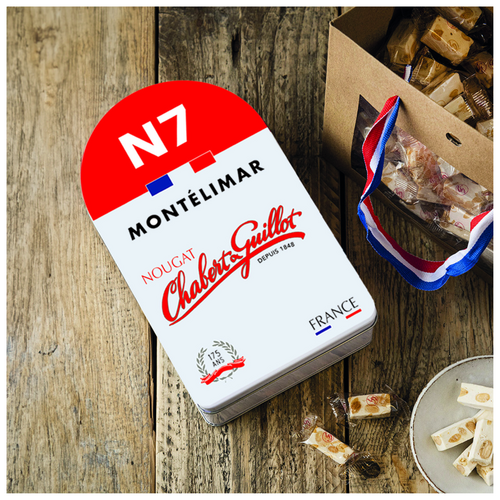 La boîte métal « Borne N7 » est le cadeau idéal pour conserver un souvenir de vacances. Elle ravira aussi tous les nostalgiques qui nous parlent d’un temps que les moins de vingt ans ne peuvent pas connaître. Bien sûr, elle contient notre savoureux Nougat de Montélimar tendre.