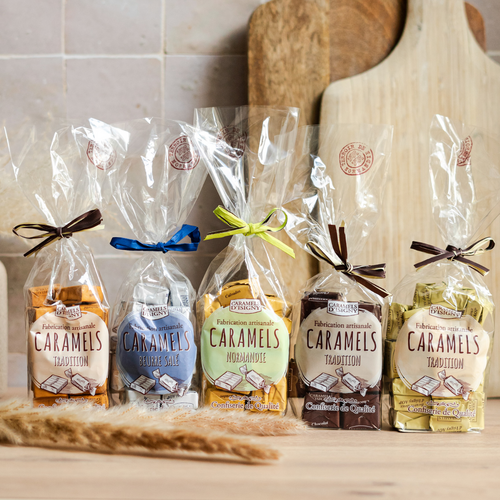 Caramels artisanaux au beurre salé fabriqués en Normandie avec beurre et crème d’Isigny AOP. Une douceur fondante et raffinée à savourer à tout moment.