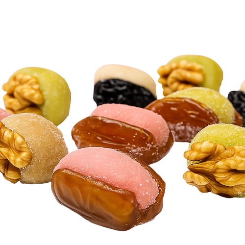 Ingrédients: Sucres, datte,noix, amandes, sirop de glucose, sucre inverti, sorbitol, arômes naturels, colorants: E120, E131, E161b.
