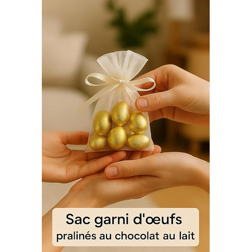 Offrez une touche d’élégance et de gourmandise avec nos sachets garnis de délicieux œufs pralinés au chocolat au lait, soigneusement emballés dans un sac en organza blanc. Chaque sachet contient 6 œufs au praliné fondant, enrobés de chocolat au lait onctueux, pour une expérience chocolatée irrésistible. Présentés dans un élégant pochon en tissu organza, ces sachets sont parfaits pour les fêtes de Pâques, les animations en hôtel, les cadeaux d’entreprise ou les événements festifs. Leur présentation raffinée les rend aussi idéaux pour les mariages, baptêmes, anniversaires ou comme petite attention pour vos invités. Conditionnés en carton de 25 sachets, ce format est idéal pour les professionnels (CSE, hôtels, restaurants, organisateurs d’événements) ou les particuliers souhaitant préparer une belle animation gourmande à grande échelle.