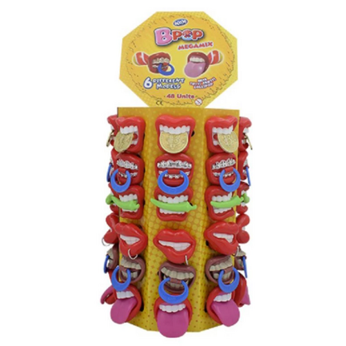 La sucette B-Pop Mega Mix est une confiserie ludique et décalée qui attire immédiatement l’attention grâce à son design original en forme de bouche. Véritable classique de la confiserie fun, elle séduit aussi bien les enfants que les adolescents par son aspect humoristique et ses saveurs gourmandes. Chaque sucette représente une bouche colorée agrémentée de différents accessoires comestibles : langues, dents, bagues ou pièces décoratives, pour une expérience à la fois visuelle et gustative.