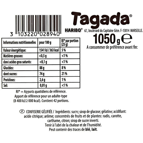 (F) CONFISERIE GÉLIFIÉE / Ingrédients: sirop de glucose; sucre; dextrose; gélatine; acidifiant: acide citrique; concentrés de fruits et de plantes: carthame, spiruline, pomme; arôme; colorants: carotènes végétaux, lutéine, anthocyanes; agents d’enrobage: cire d’abeille blanche et jaune, cire de carnauba. Tenir à l’abri de la chaleur et de l’humidité. Peut contenir des traces de BLE, LAIT.