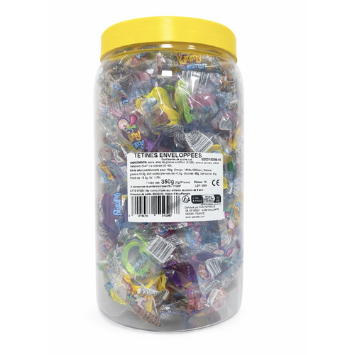 Les tétines sucrées enveloppées Zip & Zap sont un grand classique de la confiserie qui séduisent aussi bien les enfants que les adultes nostalgiques. Présentées en tubo de 70 pièces, ces tétines multicolores offrent une texture tendre et fondante, associée à une saveur sucrée douce et agréable.